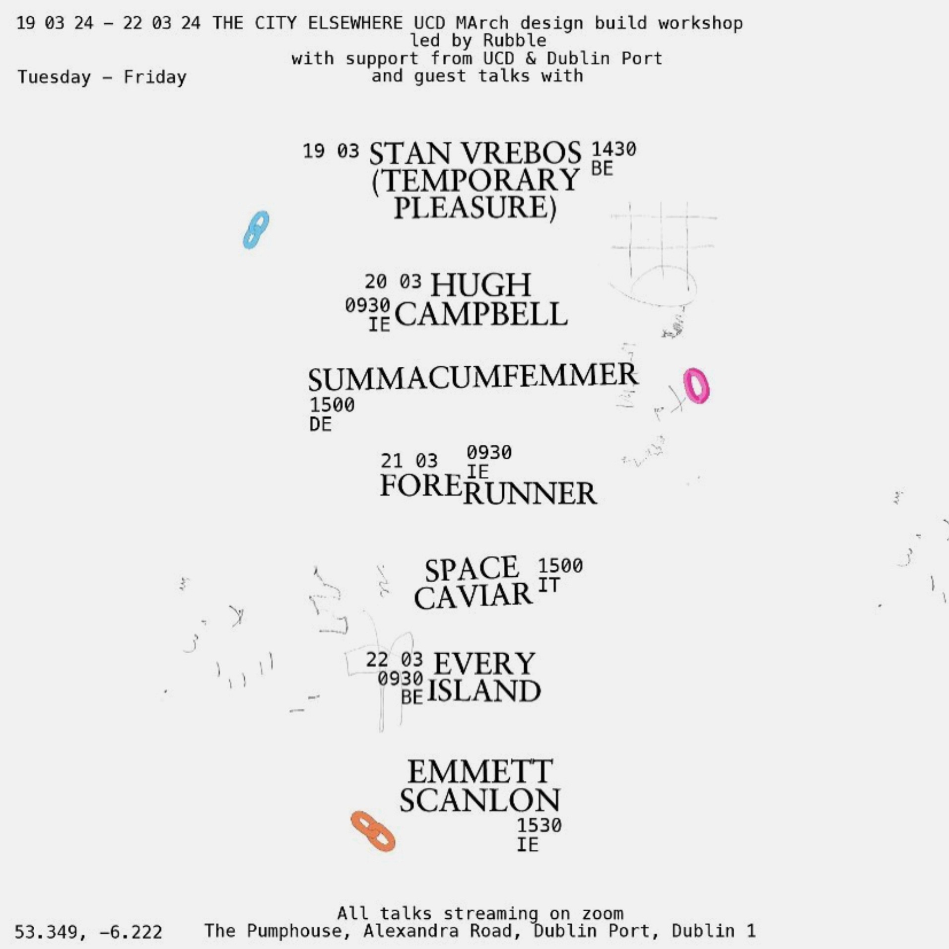 Rubble is a design and research collective founded in Dublin in 2023, starting from a desire to make things together. Their collaborations are concerned with finding alternative means of producing space, which are experimental, collaborative, and largely non-extractive, provoking new connections between people and place, while simultaneously exploring their own aesthetic identities.
